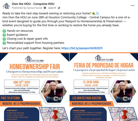 Elmore led the paid social campaign to amplify reach and ensure that prospective homebuyers across Houston and Harris County were aware of the fair. The strategy emphasized accessibility, directing audiences to registration and educational resources while reinforcing Own the HOU’s collaborative mission.